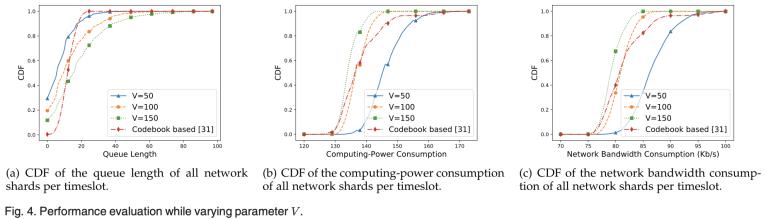 第一組實(shí)驗(yàn)本文評(píng)估了調(diào)節(jié)參數(shù) V 對(duì)實(shí)驗(yàn)結(jié)果的影響。將 V 設(shè)置為50、100和150進(jìn)行實(shí)驗(yàn)。此外,為了研究動(dòng)態(tài)調(diào)節(jié)參數(shù) V 的效果,本文還實(shí)現(xiàn)了一種基于codebook的方法,在該方法下,V 在[50, 150]范圍內(nèi)根據(jù)分片的隊(duì)列擠壓和資源消耗的變化進(jìn)行自適應(yīng)變化。實(shí)驗(yàn)結(jié)果可得在改變參數(shù)V的幾種情況下,區(qū)塊鏈網(wǎng)絡(luò)都可以保持在穩(wěn)定的狀態(tài),同時(shí)本文使用的虛擬隊(duì)列技術(shù)可以令使用到的資源保持在各自給定的預(yù)算范圍內(nèi)。此外,提高 V 值,可以有效降低資源消耗量,即算力和網(wǎng)絡(luò)帶寬的消耗量。因此,資源消耗量與 V 值呈負(fù)相關(guān)。然而,較大的 V 會(huì)導(dǎo)致隊(duì)列長(zhǎng)度的增加,從而延長(zhǎng)交易處理的等待時(shí)延。因此,隊(duì)列長(zhǎng)度與 V 值呈正相關(guān)。綜上所述,在實(shí)際情況中,本文需要通過(guò)調(diào)節(jié)參數(shù)V仔細(xì)權(quán)衡交易處理的資源消耗與排隊(duì)延遲之間的關(guān)系。