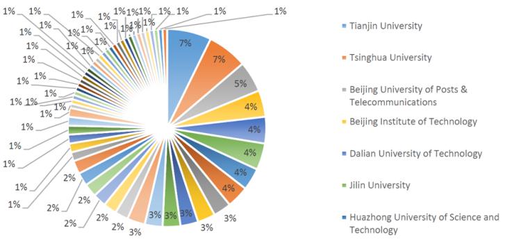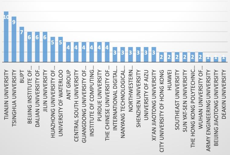 可以看出,138位作者的所在大學/科研機構(gòu)呈現(xiàn)較為均勻的分布。其中,來自Tianjin University, Tsinghua University 的作者最多。此外,還有來自以下高?;蛘呖蒲袡C構(gòu)的一位作者參與了某一篇論文: