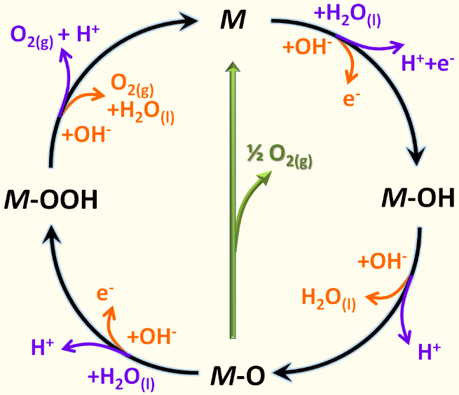 通常,在金屬(M)催化劑(包括貴金屬和過渡金屬)催化的OER過程中,M-O鍵相互作用對催化劑表面中間體的穩(wěn)定有顯著作用,對整體電催化效率有顯著影響。在堿性和酸性介質(zhì)中,OER反應(yīng)機理可以寫成如下(中間綠色箭頭表示生成氧的可能性,而不是M-OOH中間體)(詳見圖1) 【1】。