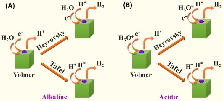 析氫反應(yīng)(HER)的催化活性與氫氣(ΔGH*)的吸附自由能有關(guān)。HER可基于Volmer-Heyrovsky機制或Volmer-Tafel機制發(fā)生(如圖2所示) 【1】。在堿性(圖2A)或酸性(圖2B)介質(zhì)中,HER的演化步驟相似。HER的第一步是在酸性介質(zhì)中與H3O+發(fā)生Volmer反應(yīng)生成H*,在堿性介質(zhì)中與H2O發(fā)生Volmer反應(yīng)生成H*(見公式13和16)。第二步是速率決定步驟(RDS),它取決于這些催化劑的活性(見公式14,15,17,18)。如Pt基催化劑,Tafel反應(yīng)吸附H*和H*生成H2,而過渡金屬催化劑通常與H2O(堿性)或H+ 即H3O+(酸性)和H*反應(yīng)生成H2。反應(yīng)路徑不同的原因是Pt金屬上的ΔGH*接近于零,而過渡金屬上的ΔGH*非常高。