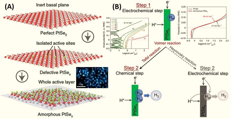 氫的吸附能力是設(shè)計氫能電催化劑時需要考慮的重要因素之一。例如,PtSex單層非晶催化劑表現(xiàn)出優(yōu)異的HER催化性能(過電位為0 V, Tafel斜率為39 mV dec-1),與純Pt表面催化劑(固相電位為0 V, Tafel斜率為37 mV dec-1)相似(見圖3) 【2】。PtSex催化劑具有高密度的單原子層結(jié)構(gòu)(圖3A),在步驟2中表現(xiàn)出高度的Tafel反應(yīng)機理(化學(xué)步驟)(圖3B)。特別是,理論計算表明,與晶體結(jié)構(gòu)催化劑相比,非晶態(tài)超薄結(jié)構(gòu)可以大大提高催化劑的氫吸附性能。其中單層非晶PtSex催化劑的ΔGH*在0 eV附近,原始結(jié)晶PtSe2催化劑的ΔGH*高于1 eV。其他非晶催化劑(如非晶Pd量子點)在HER (Tafel斜率為30.0 mV dec-1)中也表現(xiàn)出類似的增強效果【3】。