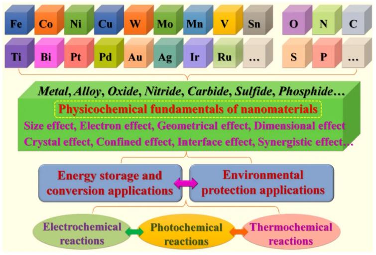 能源和環(huán)境的可持續(xù)發(fā)展是當(dāng)今世界人類社會的兩大戰(zhàn)略。隨著全球經(jīng)濟的發(fā)展,人們對能源的需求日益增長,發(fā)展新能源勢在必行;同時,在技術(shù)發(fā)展過程中加強環(huán)境保護(hù)和生態(tài)修復(fù)也是當(dāng)務(wù)之急。納米材料具有獨特的力學(xué)、電學(xué)、磁學(xué)、光學(xué)、化學(xué)和催化等性能,為能源開發(fā)和環(huán)境保護(hù)開辟了新的研究和應(yīng)用領(lǐng)域。目前,各種金屬或非金屬納米材料在能源(能量存儲和轉(zhuǎn)換)和環(huán)境(環(huán)境保護(hù))相關(guān)技術(shù)應(yīng)用中發(fā)揮著重要作用。能源和環(huán)境應(yīng)用通常涉及納米材料的物理化學(xué)反應(yīng)過程(例如,電化學(xué)反應(yīng)、光化學(xué)反應(yīng)或熱化學(xué)反應(yīng))。