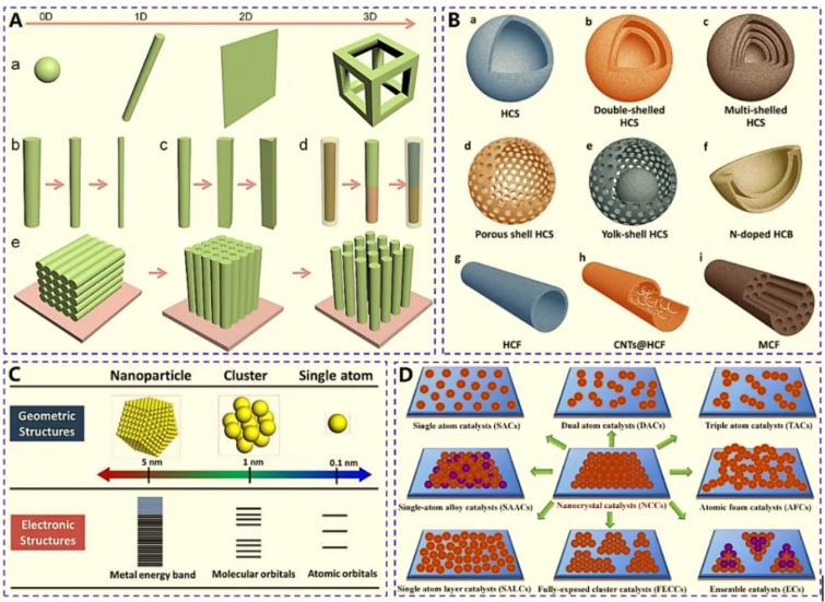 Fig. 1-2 (A) Schematics of nanostructures: (a) 0D to 3D nanostructures, variable structure parameters of (b) size, (c)morphology, (d) heterojunction, (d) spatial arrangement; (B) Schematics of nanostructures: (a-c) different-shell hollow nanospheres, (d, e) porous nanocages, (f) nanobowls, (g-i) hollow or porous nanowires; (C) Schematics of geometric and electronic structures; (D) Schematics of atomically-dispersed sub-nanostructures