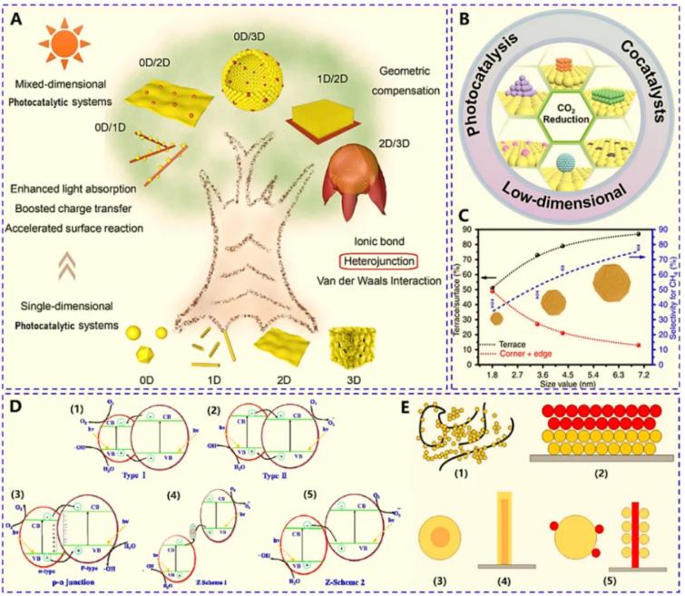Fig. 1-3 (A) Schematics of nanostructured photocatalysts; (B) Schematics of nanostructured co-catalysts; (C) Schematics of size diminishing of co-catalyst; (D) Schematics of heterojunction charge transfer; (D) Schematics of heterojunction dimension structure .
