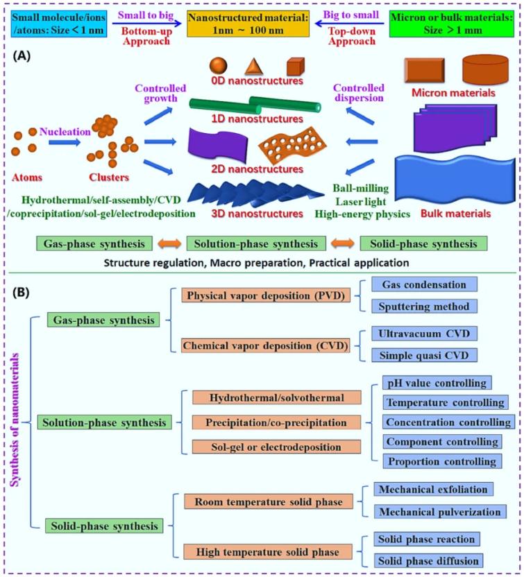 Fig. 5-1 (A) Preparation approaches of nanomaterials, and (B) Synthetic methods of nanomaterials.