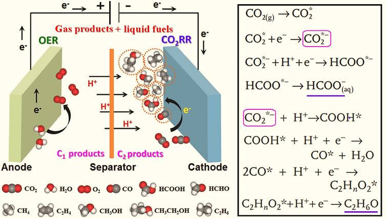 雖然氫氣(H2)是最佳的儲能分子載體,但將二氧化碳(CO2)和水(H2O)轉化為碳基燃料(例如CO、HCOOH和CH3CH2OH)的科學研究在最近一二十年來一直吸引著人們的興趣?;诖呋^程的二氧化碳還原反應(CO2RR) 最常見的包括電催化和光催化兩大類別,具體的反應機制如下: