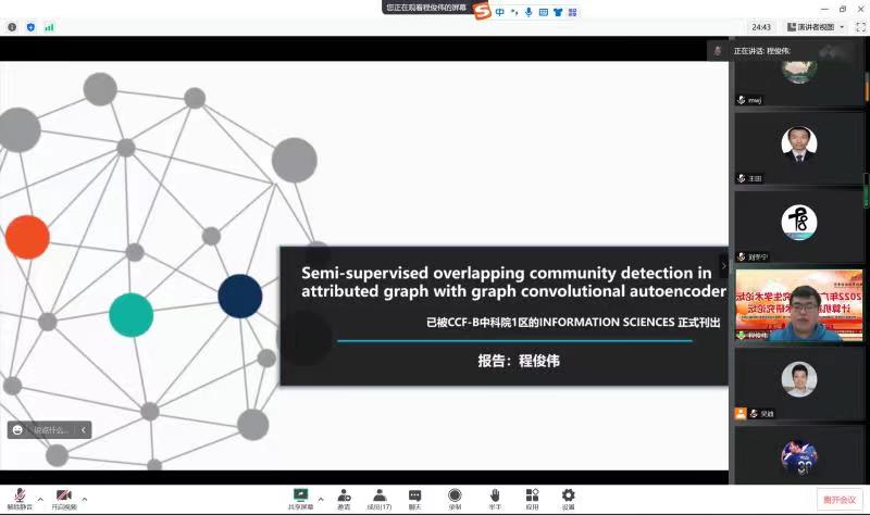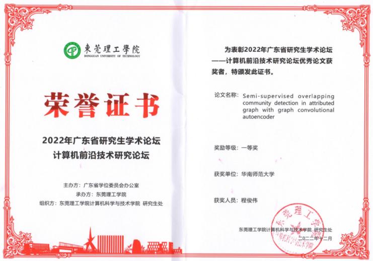 12月3日,圖數(shù)據(jù)挖掘與教育計(jì)算研究組(Graph4EDM) 碩士研究生程俊偉(指導(dǎo)老師:湯庸教授、賀超波教授)參加了2022年廣東省研究生學(xué)術(shù)論壇之計(jì)算機(jī)前沿技術(shù)研究論壇,做了題為“Semi-supervised overlapping community detection in attributed graph with graph convolutional autoencoder”的論文報(bào)告,并獲得優(yōu)秀論文評(píng)選一等獎(jiǎng)。
