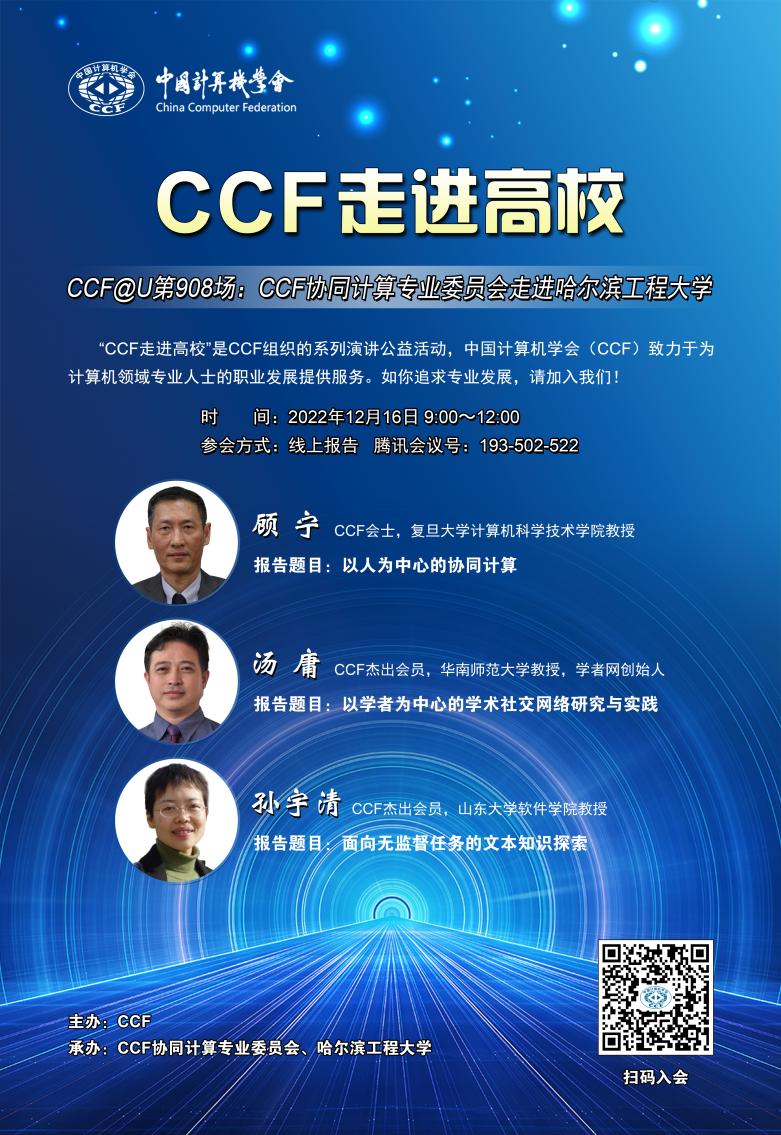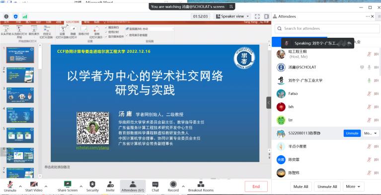 2022年12月16日分別做了“CCF@U908-協(xié)同計算專業(yè)委員會走進(jìn)哈爾濱工程大學(xué)“”和”廣州市教育研究院”兩個線上報告。CCF走進(jìn)哈工程報告題為“以學(xué)者為中心的學(xué)術(shù)社交網(wǎng)絡(luò)研究與實踐”,在廣州市教研院的報告題為“如何應(yīng)用社交網(wǎng)絡(luò)建設(shè)虛擬教研室開展教研和教學(xué)工作”。