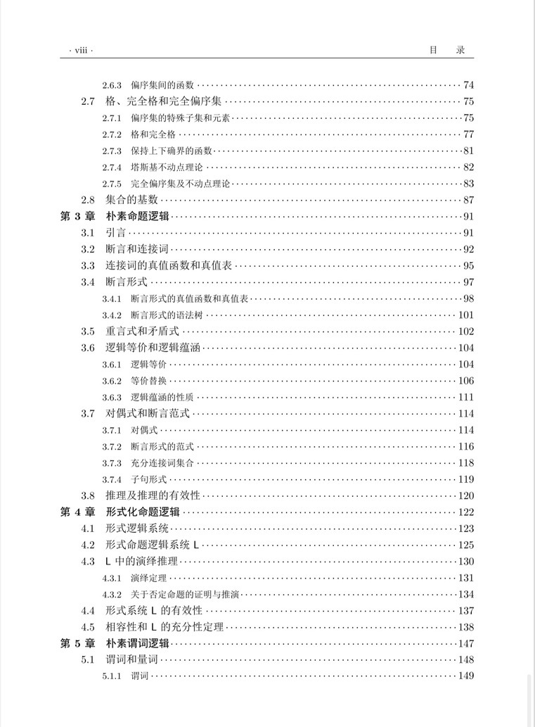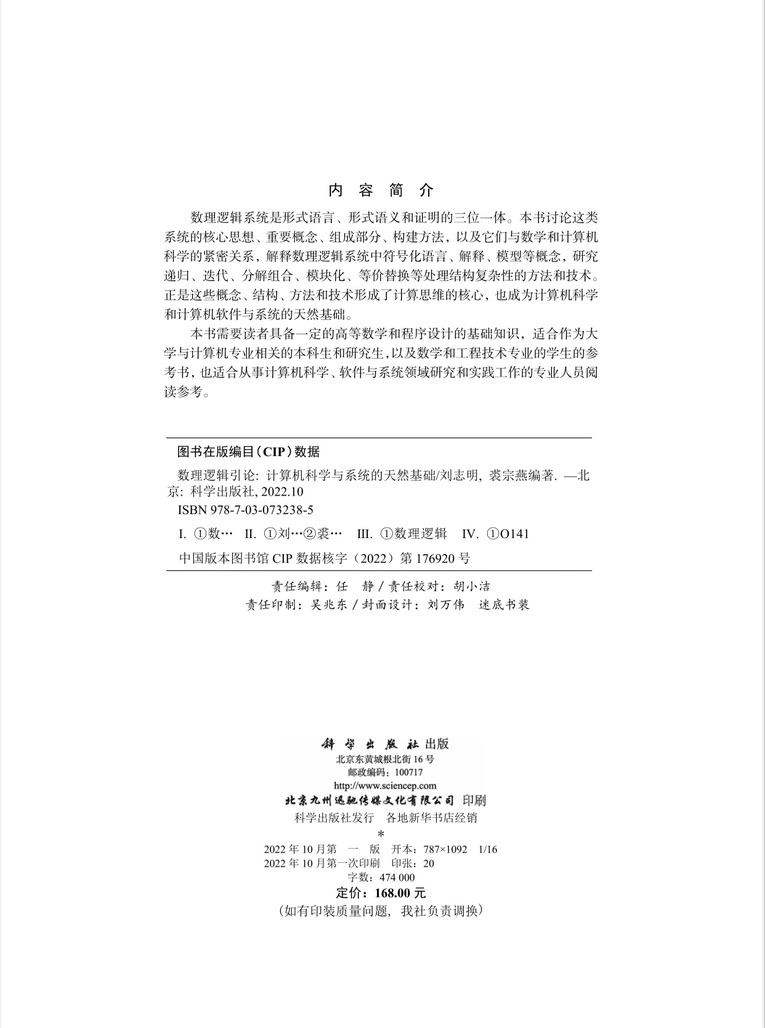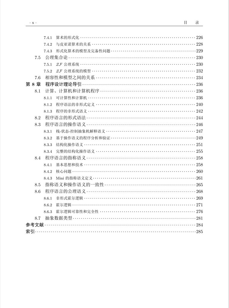 本書旨在介紹建立形式語(yǔ)言、形式語(yǔ)義和證明三位一體的數(shù)理邏輯系統(tǒng)所涉及核心思想、概念、組成部分和過(guò)程,建立數(shù)理邏輯與數(shù)學(xué)和計(jì)算機(jī)科學(xué)的緊密關(guān)系,揭示數(shù)理邏輯中符號(hào)化語(yǔ)言、解釋、模型、模型扽的概念 以及遞歸、算法、分解組合、模塊化、等價(jià)替換等處理結(jié)構(gòu)復(fù)雜性處理的方法和技術(shù)形成計(jì)算思維的核心以及計(jì)算機(jī)科學(xué)和計(jì)算機(jī)軟件與系統(tǒng)的天然基礎(chǔ)。為此,第一章:導(dǎo)論,介紹了數(shù)理邏輯發(fā)張背景和過(guò)程;第二章:離散數(shù)學(xué)基礎(chǔ)提供了必要的數(shù)學(xué)準(zhǔn)備。本書選擇了數(shù)理邏輯中最基本的內(nèi)容, 包括第三章:樸素的命題邏輯、第四章:形式命題邏輯演算、第五章:樸素的謂詞邏輯和第六章:一階形式謂詞演算,介紹非形式邏輯的形式化過(guò)程,形式邏輯系統(tǒng)的重要成分和意義。之后,第七章:數(shù)學(xué)系統(tǒng),建立數(shù)理邏輯與數(shù)學(xué)的關(guān)系。最后,第八章:程序設(shè)計(jì)理論導(dǎo)論,介紹程序邏輯的核心基礎(chǔ),介紹計(jì)算機(jī)程序的語(yǔ)言的語(yǔ)法定義, 語(yǔ)義定義以及程序正確性的規(guī)約與證明的基本概念和思想。具體包括程序語(yǔ)言的操作語(yǔ)義、指稱語(yǔ)義、和公理語(yǔ)義,將程序語(yǔ)言、程序設(shè)計(jì)和程序正確性證明建立在數(shù)理邏輯的語(yǔ)法、語(yǔ)義和證明的三要素基礎(chǔ)上。