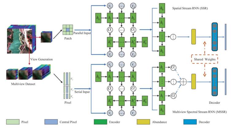 近年來,基于深度學習的方法在高光譜解混中獲得了廣泛關注,尤其是無監(jiān)督的自動編碼器(AE)網絡在高光譜解混任務中取得了優(yōu)異的性能。為了在解混中充分利用光譜信息以及空間信息,本文在基于AE的解混框架中探索了多視角光譜和空間信息。我們通過光譜劃分引入了多視角光譜信息,并提出了一個多視角空間-光譜雙流網絡(MSSS-Net)。MSSS-Net是一個共享解碼器的雙流深度解混網絡,它的兩個AE網絡采用遞歸神經網絡協作利用多視角光譜和空間信息。空間流網絡分支提取像素及其鄰域的空間特征,而多視角光譜流網絡分支則利用像素的多視角光譜信息。同時,我們?yōu)槎嘁暯强臻g-光譜信息設計了一個級聯的雙向和單向的RNNs編碼器結構,以學習區(qū)分能力更強的 patch-pixel 特征。大量實驗表明,MSSS-Net在多個數據集上取得了優(yōu)異的性能。