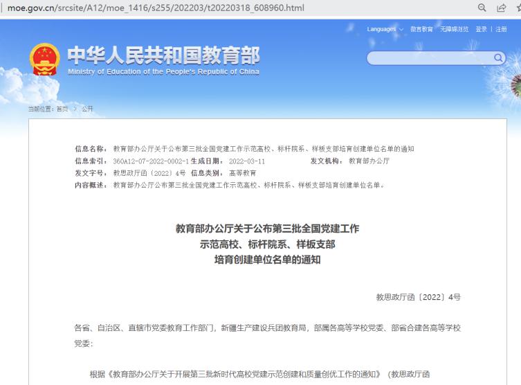 2022年3月10日,根據(jù)教思政廳函〔2022〕4號(hào)文件,教工第四黨支部成功獲批第三批國家樣板黨支部培育創(chuàng)建單位。在此,真誠地感謝學(xué)者網(wǎng)的支持。