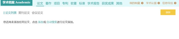 當您需要在SCHOLAT發(fā)布論文、著作等學術(shù)信息時,您可以在學術(shù)檔案中選擇對應的欄目。點擊【添加】按鈕之后進入學術(shù)信息添加頁面,您可以根據(jù)頁面提示的信息進行填寫,填寫完成后點擊保存按鈕,從而完成學術(shù)信息的添加。