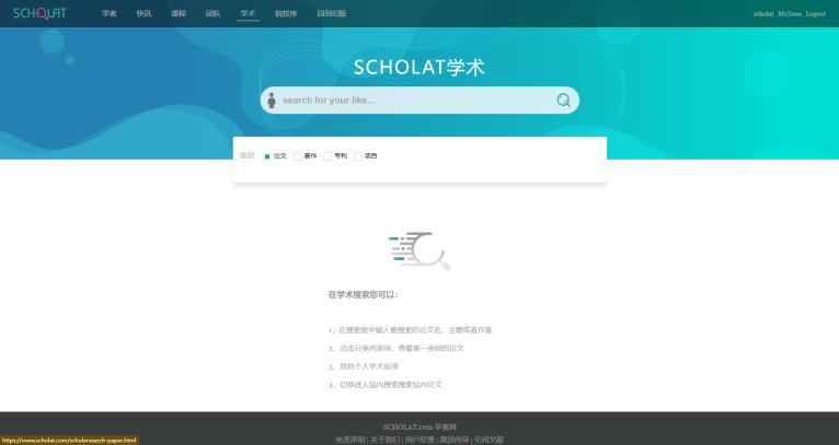 您通過首頁右上角進入搜索頁面,點擊【學術(shù)】欄目即可進入SCHOLAT學術(shù)頁面。