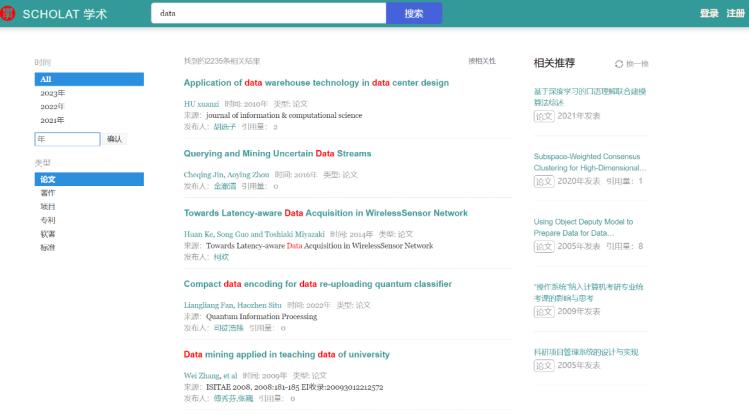 您輸入關(guān)鍵詞并檢索后,得到SCHOLAT學術(shù)搜索結(jié)果,如下圖所示。該頁面展示了用戶通過檢索關(guān)鍵詞獲取的論文信息,其中檢索到的論文集合的先后順序主要有相關(guān)性排序和年份排序兩種方式。該頁面左側(cè)是一個小功能模塊,包含了年份和類型兩個標簽,年份部分可以選擇已有的年份,同時也可以手動輸入年份范圍,類型包括論文、著作、項目、專利、軟著、標準。