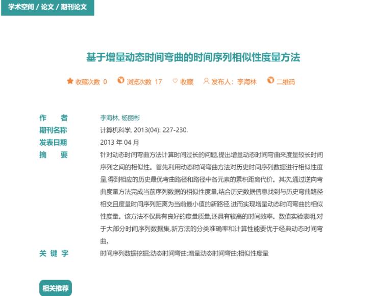 您在學術(shù)搜索結(jié)果頁面,點擊論文標題后進入該論文詳細信息頁面,該頁面展示了論文標題、作者、期刊名稱、發(fā)表時間、摘要、關(guān)鍵詞等信息。除了這些信息外,為了更好的服務用戶,我們同時提供了收藏和二維碼功能以及瀏覽次數(shù)和收藏次數(shù)信息。收藏功能方便用戶日后瀏覽,二維碼功能方便用戶分享論文,瀏覽次數(shù)和收藏次數(shù)信息可以給用戶提供參考信息。
