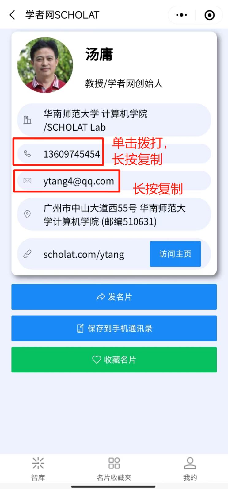 點(diǎn)擊某位學(xué)者可以查看該學(xué)者的名片信息,在名片信息頁面中,具有以下幾種功能: