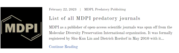專門揭露掠奪性期刊的知名學(xué)術(shù)網(wǎng)站 Predatory Reports 在今年 2 月 23 日發(fā)布消息,將知名學(xué)術(shù)出版集團(tuán) MDPI 旗下所有 422 本期刊( 413 本期刊和+9 本會議期刊)拉入掠奪性期刊的黑名單,98 本 SCIE/SSCI 期刊也未能幸免。