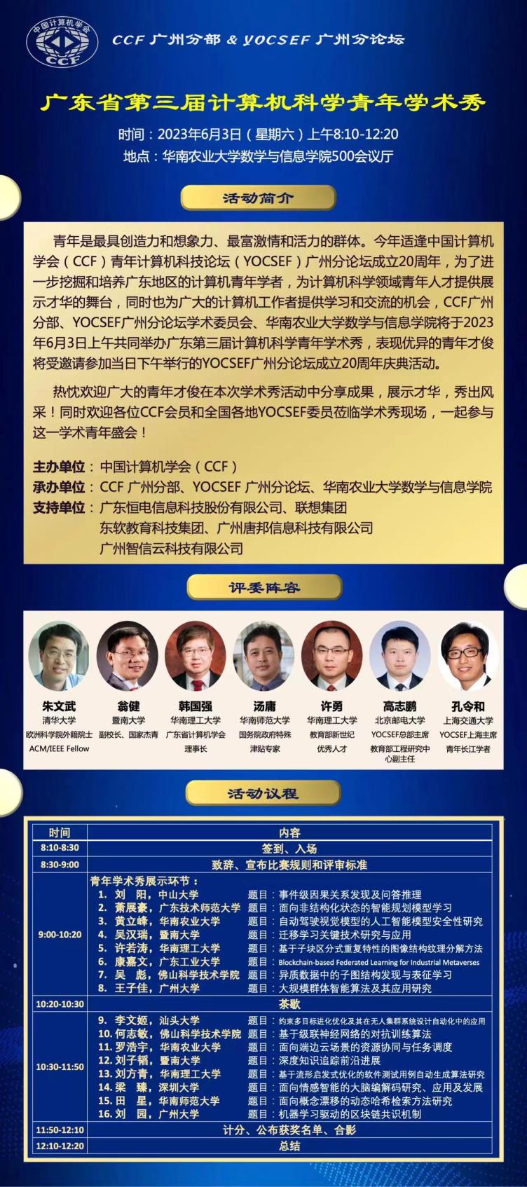 CCF秘書長唐衛(wèi)清,歐洲科學(xué)院院士、清華大學(xué)教授朱文武,暨南大學(xué)副校長翁健,YOCSEF秘書長譚曉生,CCF廣州分部主席許勇,YOCSEF廣州現(xiàn)任和歷任主席和委員等,YOCSEF總部和各地分論壇代表,以及廣東省第三屆計(jì)算機(jī)科學(xué)青年學(xué)術(shù)秀獲獎(jiǎng)人100多人參加了慶典。