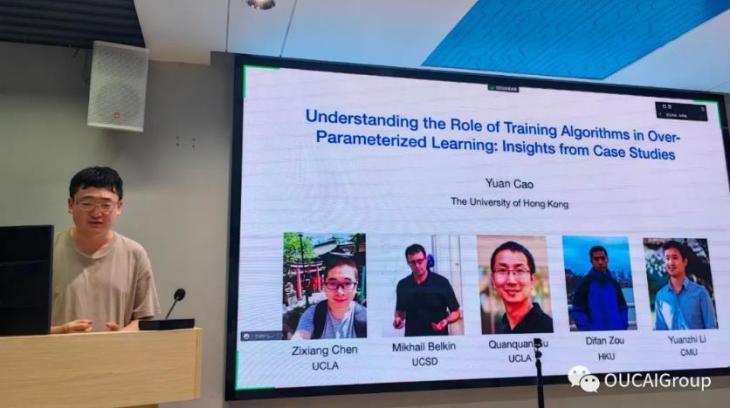2023年7月19日,香港大學曹原教授訪問中國海洋大學人工智能研究院,在信息南樓A321做了題為 ”Understanding the Role of Training Algorithms in Over-Parameterized Learning: Insights from Case Studies” 的報告。