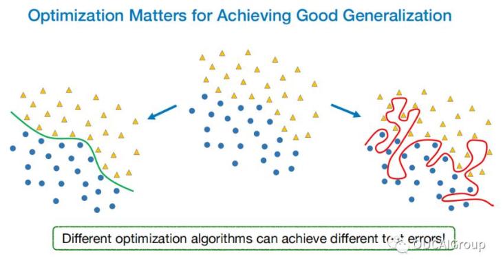 現(xiàn)代機器學習模型(比如大規(guī)模語言模型)通常包含大量參數(shù)。對于這種過參數(shù)化的模型,訓練損失函數(shù)可能存在無限多個最小化者,不同的訓練算法可能會收斂到不同的解。雖然這些解都可能在訓練時產(chǎn)生零誤差,但它們的預測誤差可能截然不同。因此,要理解大型機器學習模型,必須理解訓練算法對預測誤差的影響。曹老師首先對隨機梯度下降和Adam優(yōu)化算法之間的泛化差距進行理論解釋。證明了對于某些學習問題,梯度下降可以訓練一個兩層卷積神經(jīng)網(wǎng)絡以獲得接近零的測試誤差,而Adam算法只能達到常數(shù)級別的測試誤差。