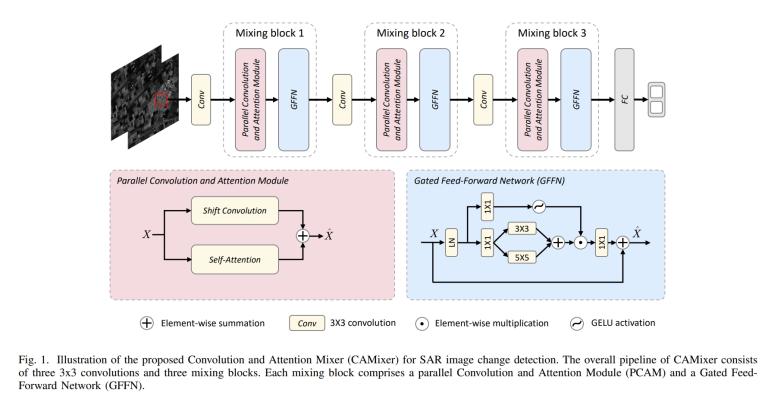 合成孔徑雷達(dá)(Synthetic Aperture Radar,SAR)圖像變化檢測是一項重要任務(wù),在遙感領(lǐng)域引起了國內(nèi)外學(xué)者的廣泛關(guān)注。然而,現(xiàn)有的SAR變化檢測方法主要基于卷積神經(jīng)網(wǎng)絡(luò)(CNNs),對全局注意力機制的考慮有限。在這個工作中,我們將Transformer架構(gòu)用于SAR變化檢測,以融合全局注意力。為此,我們提出了一個卷積和注意力混合器(CAMixer)。首先,為了彌補Transformer在歸納偏差中的不足,以并行方式將自注意力與移位卷積相結(jié)合。這種并行設(shè)計通過自注意力有效地捕捉全局語義信息,同時能夠有效的進行局部特征提取。其次,我在前饋網(wǎng)絡(luò)中采用門控機制來增強非線性特征變換,重要特征可以被強調(diào),從而抑制圖像中的斑點,產(chǎn)生高質(zhì)量的特征表示。在三個SAR數(shù)據(jù)集上的大量實驗驗證了本文所提出的 CAMixer 性能優(yōu)異。