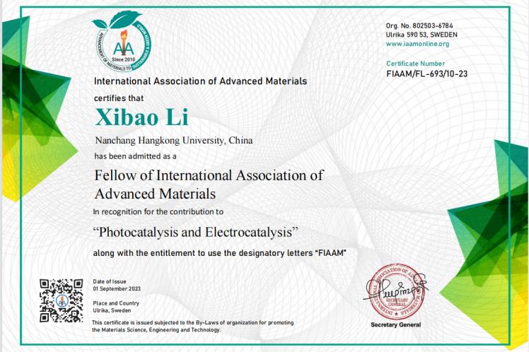 近日,南昌航空大學(xué)材料科學(xué)與工程學(xué)院李喜寶教授當(dāng)選國(guó)際先進(jìn)材料協(xié)會(huì)會(huì)士(Fellow of International Association of Advanced Materials, FIAAM)。該學(xué)術(shù)榮譽(yù)表彰其在“光/電催化”研究領(lǐng)域所作出的重要貢獻(xiàn)。李喜寶教授于2023年8月28-31日應(yīng)邀參加在瑞典斯德哥爾摩舉辦的第55屆國(guó)際先進(jìn)材料大會(huì)(Advanced Materials Congress),作了主題為太陽(yáng)能光/電催化的線上會(huì)士報(bào)告(Invited IAAM Fellow Lecture),并作為Session Chair主持“Photocatalysis & Electrocatalysis”分會(huì)場(chǎng)的學(xué)術(shù)報(bào)告與交流。