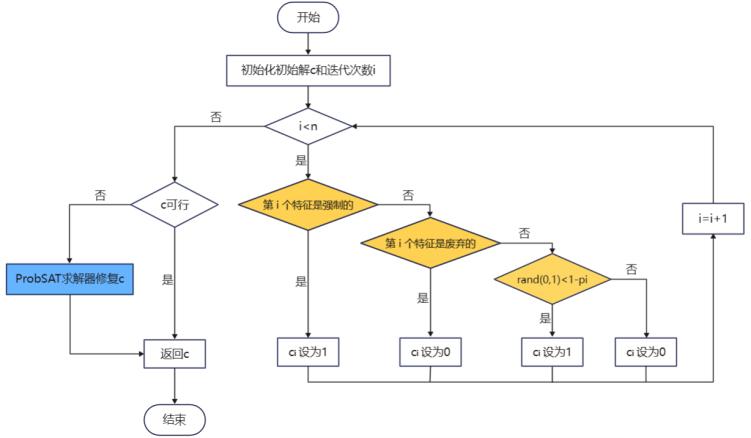dSATNS算法結合了兩類多樣性求解器,依概率調用rSAT4J [2]和ProbSAT。其中,rSAT4J是隨機化版本的SAT4J [3],旨在產(chǎn)生不相似的SAT解;而dProbSAT則是研究人員提出的ProbSAT [4]的改進算法。如圖2所示,dProbSAT借助概率向量產(chǎn)生一個多樣化的初始解c,若c不可行,則調用原始的ProbSAT予以修復。作為一個通用框架, 該算法適用于任何SLS類型的SAT求解器。
