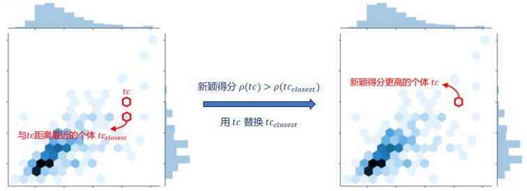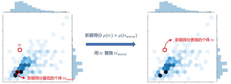 dSATNS根據(jù)NS算法采用了兩種歸檔策略GlobalArch(見圖3)和LocalArch(見圖4),分別考慮了測試集的全局多樣性和局部多樣性。新穎得分是NS算法中的核心概念,度量個體所在區(qū)域的擁擠程度。新穎得分越高,說明個體所在區(qū)域越稀疏,反之則越密集。GlobalArch通過不斷搜索新穎得分更高的個體并替換,提高了測試集的整體多樣性,但忽略了新個體所在區(qū)域的局部信息。新個體的加入可能會導致出現(xiàn)局部聚集的現(xiàn)象,而在LocalArch的策略中,新測試用例及與其最近的測試用例不能同時存在,提高了測試集的局部多樣性。
