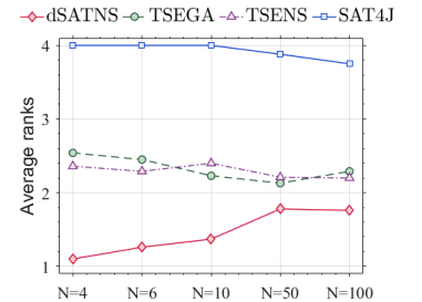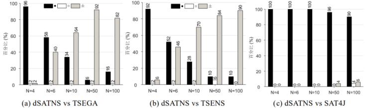 圖5給出了dSATNS與各主流算法關于缺陷檢測率的U檢驗結果。由圖5可知,無論 N(測試集規(guī)模)多大,dSATNS 始終優(yōu)于TSEGA [5]和TSENS [5]。當N較小時,dSATNS的優(yōu)勢尤其明顯;當N較大時,dSATNS在80%以上的特征模型上與其對比算法無顯著的統(tǒng)計差異。與SAT4J [3]相比,dSATNS始終具有壓倒性優(yōu)勢。