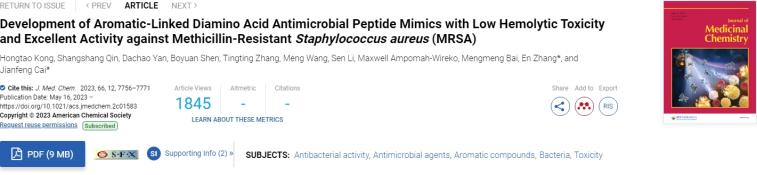 很幸運(yùn)課題組抗菌肽模擬物的JMC稿件被選為當(dāng)期封面文章,感謝合作者蔡老師,秦老師和研究生孔洪濤