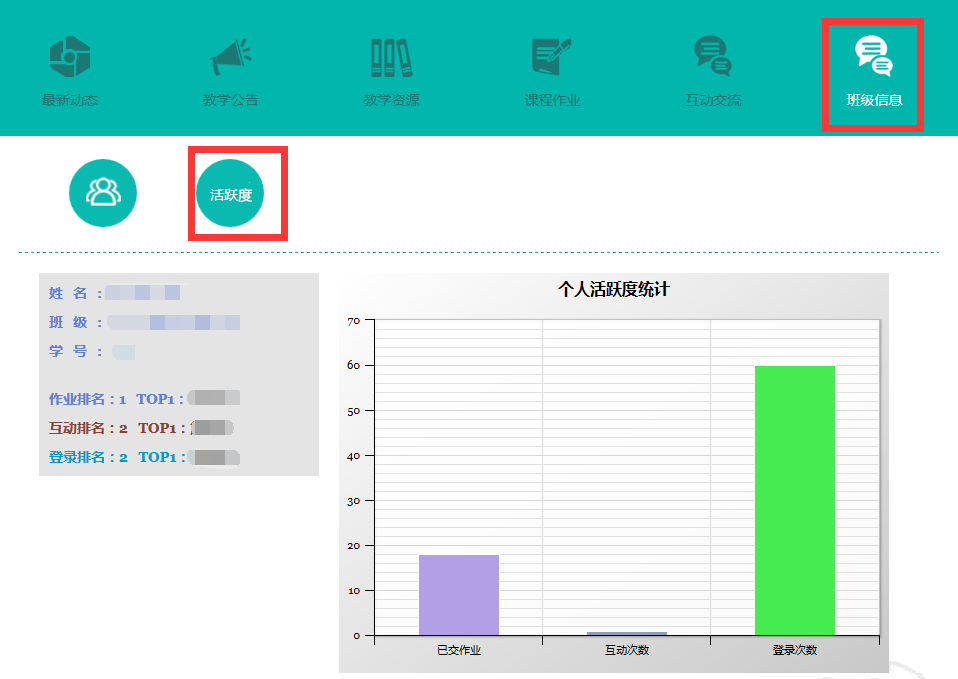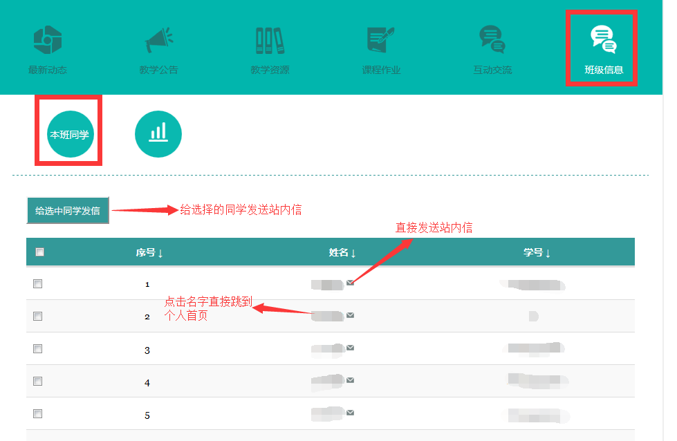 通過點(diǎn)擊“班級信息”可以進(jìn)入班級信息。在這里你可以查到同班同學(xué)的個人信息,也可以通過點(diǎn)擊姓名后邊的郵件圖標(biāo)或者同時選中多個同學(xué)發(fā)送站內(nèi)信。還可以查看班級里同學(xué)的活躍信息哦!如圖7.1,7.2所示: