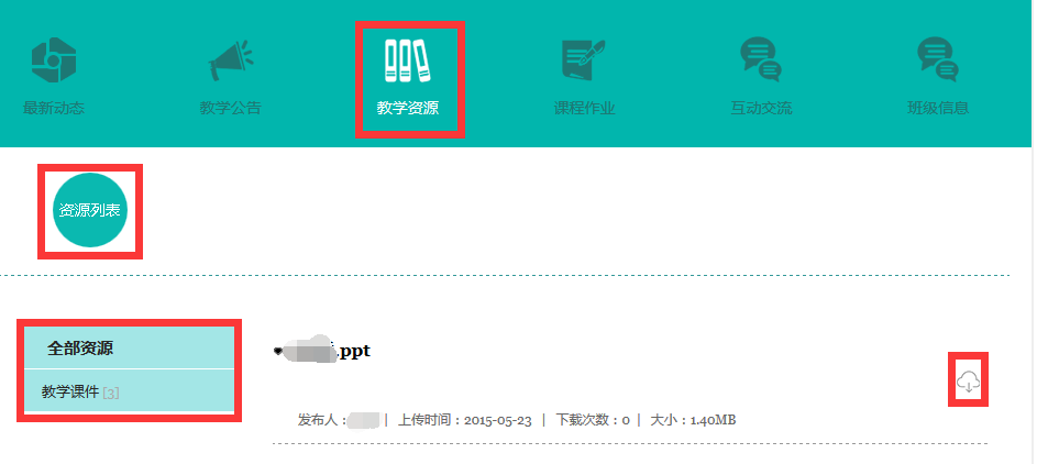 點(diǎn)擊“教學(xué)資源”可以查看教師分享的該門課程的所有資源,左側(cè)是資源分類,中間部分是相應(yīng)分類下的資源,學(xué)生可以點(diǎn)擊相應(yīng)資源右邊的按鈕進(jìn)行資源下載。如圖4所示: