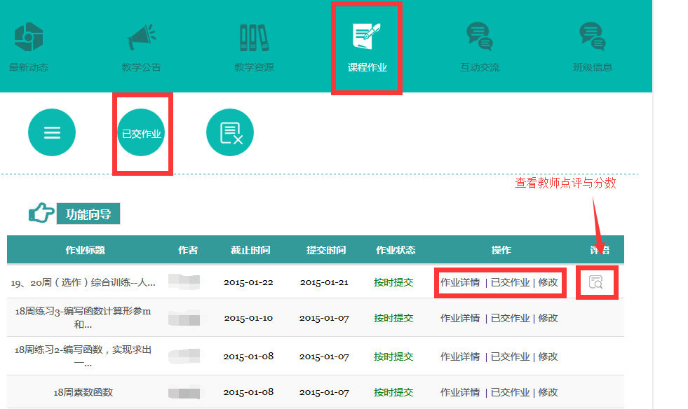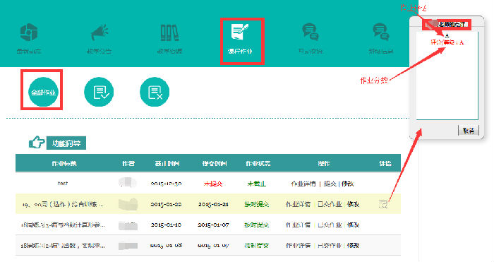 點(diǎn)擊“課程作業(yè)”, 學(xué)生可查看自己的全部作業(yè),已交作業(yè)和未交作業(yè),以及直觀化的作業(yè)狀態(tài)(按時提交,延時提交,已截止,未截止等狀態(tài)),并可查看老師評語,如圖5.1所示: