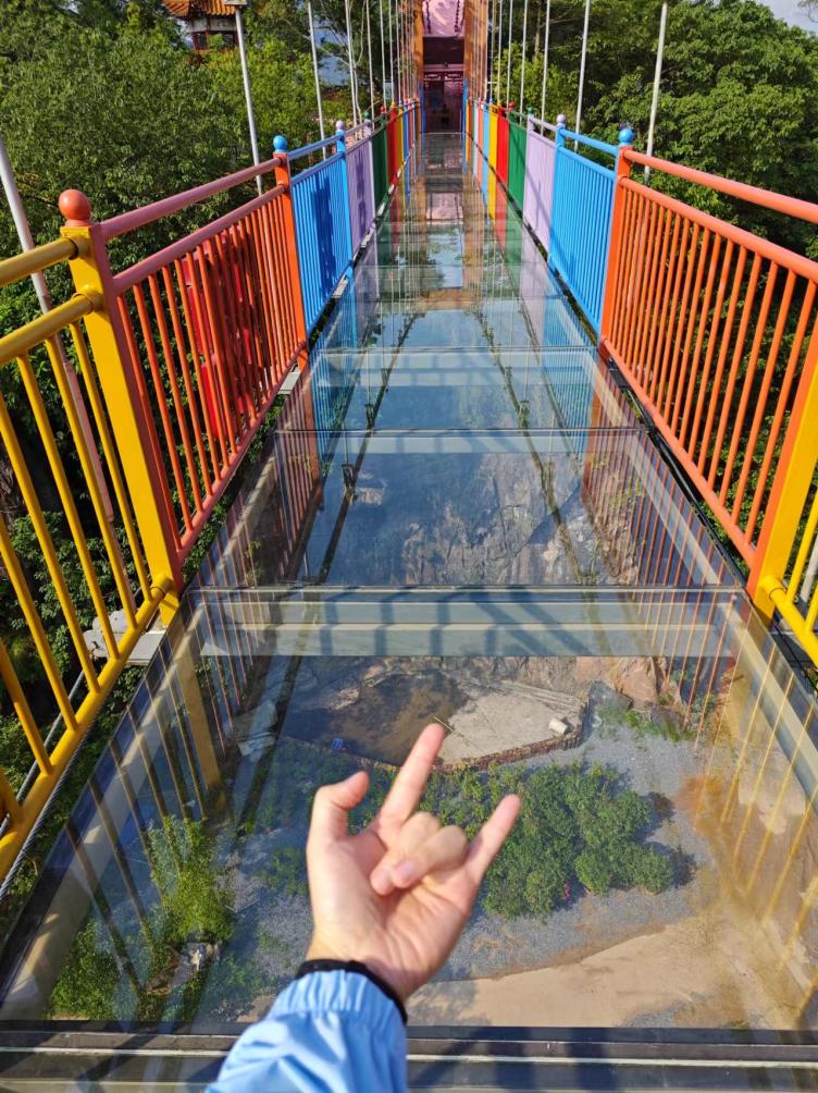 來到驚險(xiǎn)的玻璃棧道,腳底是茂密的森林和湍流的小溪,看一眼就足以讓恐高的崽崽雙腳打顫,直冒冷汗,在小伙伴們的鼓勵(lì)和支持下,本著咱們探險(xiǎn)團(tuán)隊(duì)迎難而上、永不服輸?shù)木?,區(qū)區(qū)玻璃棧道,恐高崽崽也輕松拿下!