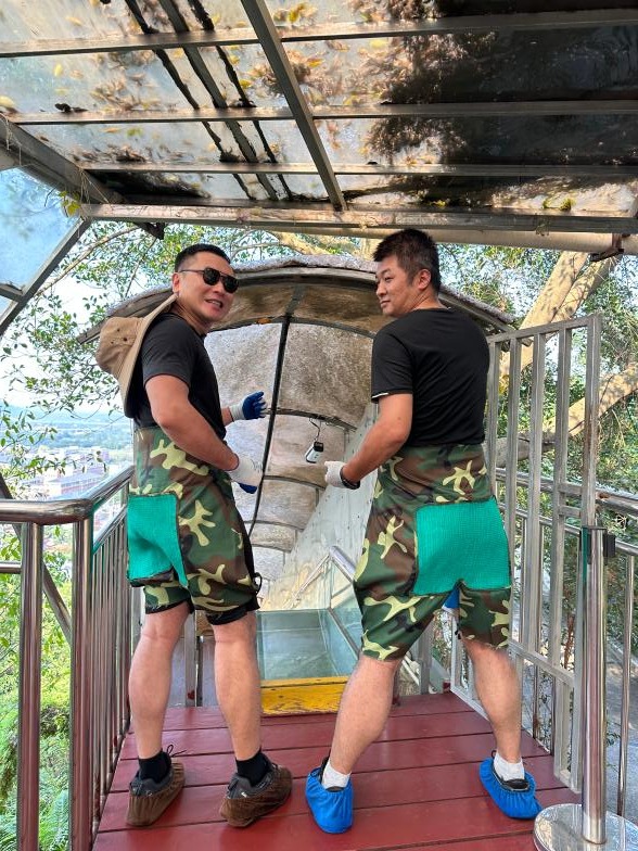 為了以“最快”的方式到達(dá)山腳下,我們體驗(yàn)了一次超長(zhǎng)玻璃“滑滑梯”。穿戴好護(hù)具后,以極快的速度往下滑。大家注意,歷史性的一刻誕生了,兩位真正男子漢在此實(shí)現(xiàn)了他們的合體!