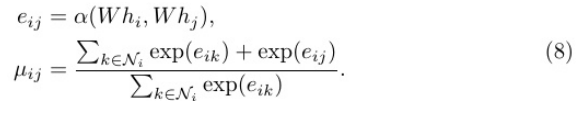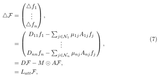 其中Latt= D−M⊙A表示替換拉普拉斯矩陣的注意力感知聚合算子。M是 一個關注矩陣Mij=µij,其結構與鄰接矩陣a相同,值得注意的是,Mij=Mji 表示M是不對稱的。與Eq. 5中的拉普拉斯矩陣相反,Latt的參與導致了這 種不對稱性,從而破壞了拉普拉斯矩陣的頻譜分解。因此,我們將Latt單獨作為一個空間增強的聚合算子進行強制。特別是,受圖注意力網(wǎng)絡 (GAT)模型[30]的啟發(fā),我們采用了一種注意力機制來動態(tài)計算每個相鄰 節(jié)點的注意力系數(shù)µij,如下所示: