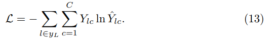 其中C是類的數(shù)量,yL是帶標簽的節(jié)點索引集。Ylc表示屬于c類的節(jié)點l的實際 標簽值,Yˆlc為對應的預測概率值。