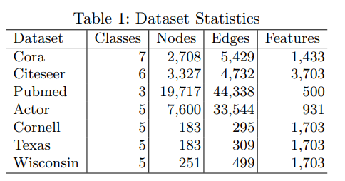 全監(jiān)督數(shù)據(jù)集。我們使用了一個名為actor[16]的行動者共現(xiàn)網(wǎng)絡以及三個網(wǎng) 頁數(shù)據(jù)集:Cornell, Texas和wisconsin -sin[25],用于完全監(jiān)督節(jié)點分類。Actor 數(shù)據(jù)集捕獲從維基百科頁面中提取的參與者之間的共現(xiàn)關系,其中節(jié)點特征 是基于從參與者各自的維基百科頁面中獲得的相關關鍵字構建的。在網(wǎng)頁數(shù) 據(jù)集中,節(jié)點表示不同網(wǎng)頁之間的超鏈接,每個節(jié)點的特征對應于與網(wǎng)頁內(nèi) 容相關的代詞的嵌入表示。為了確保標準化的方法,我們遵循了先前研究中 提出的方法來進行完全監(jiān)督的實驗。具體來說,對于每個數(shù)據(jù)集,我們將每 個類的節(jié)點隨機劃分為訓練集(60%)、驗證集(20%)和測試集(20%)。所有模 型的性能在10個隨機分割的測試集上進行測量。