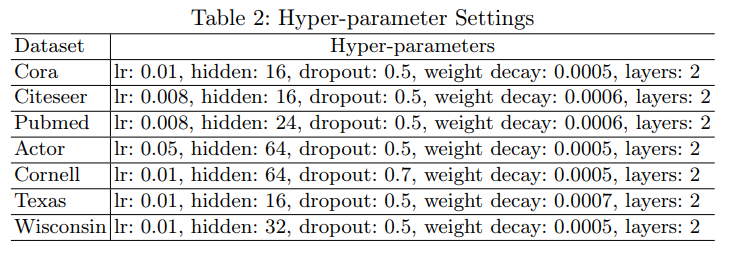 對于半監(jiān)督和全監(jiān)督實驗的評價任務,我們設置Adam SGD[18]作為優(yōu) 化算法。在訓練過程中,我們通過監(jiān)測驗證集上的最佳訓練性能,以固定 的epoch數(shù)實現(xiàn)早期停止,以減輕過度擬合的風險。我們使用模型隱藏層的 L2范數(shù)和權重衰減系數(shù)作為損失函數(shù)的懲罰項,這提高了模型的泛化能力。 對于我們模型中使用的超參數(shù),表2總結了AoSE-GCN,它在驗證數(shù)據(jù)集上達到了最佳性能。