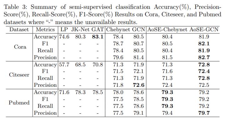 表3給出了半監(jiān)督分類的各種指標的結果。正如我們所看到的,就所有指標 而言,AoSE-GCN比基線GCN模型表現(xiàn)得更好。同樣,與Chebynet基線模型 相比,AoSE-Chebynet也獲得了具有競爭力的結果。這一觀察得出的結論是, 我們的注意力感知聚合算子有效地增強了像GCN和Chebynet這樣的模型, 它們都依賴于Chebyshev多項式近似的卷積。當應用于同構圖數(shù)據(jù)集時,這種增強尤為顯著。