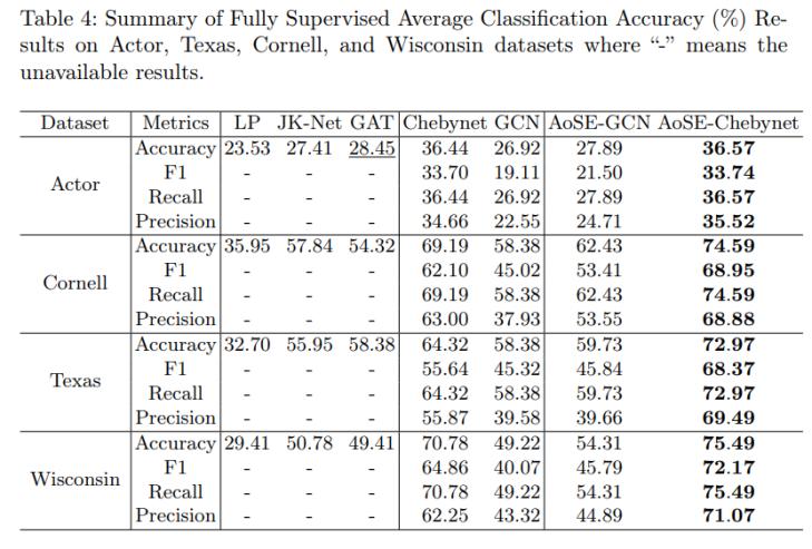 在表4中,我們給出了異構圖數(shù)據(jù)集上完全監(jiān)督節(jié)點分類的結果。值得注意的是,基線模型Chebynet在異構圖結構上下文中驚人地優(yōu)于GCN方法。 這種現(xiàn)象可能歸因于GCN模型是拉普拉斯平滑的一種特殊情況,它可以更 快地進行過度平滑,特別是在較小的數(shù)據(jù)集上,如[23]所示。然而,AoSEGCN和AoSE-Chebynet模型的引入證明了這一點,應用于異構圖時,與基本模型相比,性能上的改進。