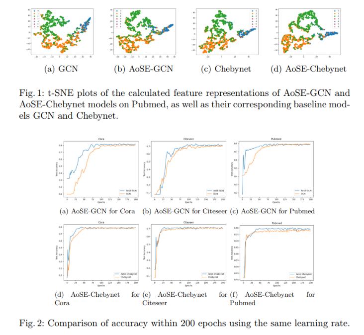 此外,我們在圖2中比較了基本模型和增強模型在學術數(shù)據(jù)集上的收斂速度。我們觀察到AoSE-GCN和AoSE-Chebynet具有更快的收斂速度。這可以歸因于鄰域特征的加權聚合。