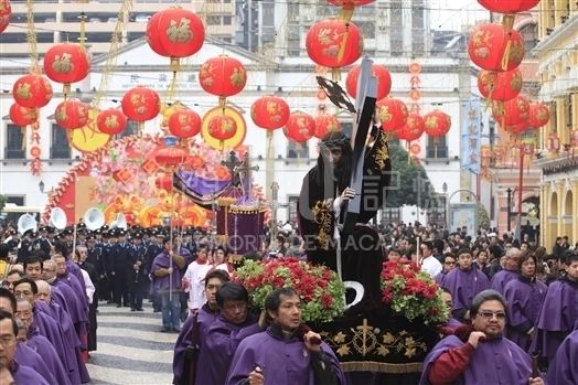 上︰議事亭前地的苦難善耶穌聖像出遊;下︰大三巴哪咤廟酬神,陳顯耀攝 (ID. p0003433, p0003465)