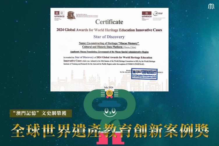 澳門基金會開展的 “澳門記憶” 文史網(wǎng),今年8月迎接開站5周年,稍早前榮獲UNESCO亞太地區(qū)世界遺產(chǎn)培訓(xùn)與研究中心籌劃的《全球世界遺產(chǎn)教育創(chuàng)新案例獎》,標(biāo)誌著文史網(wǎng)邁向新里程。