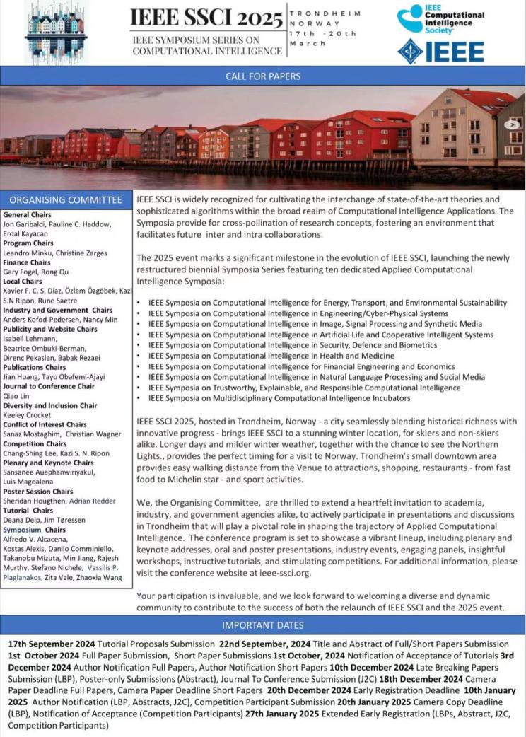 Submissions are welcome to the 2025 IEEE Symposium Series on Computational Intelligence! https://ieee-ssci.org/ . IEEE SSCI is a flagship conference taking place in Trondheim, Norway, from March 17-20, 2025, and featuring around 10 symposia.