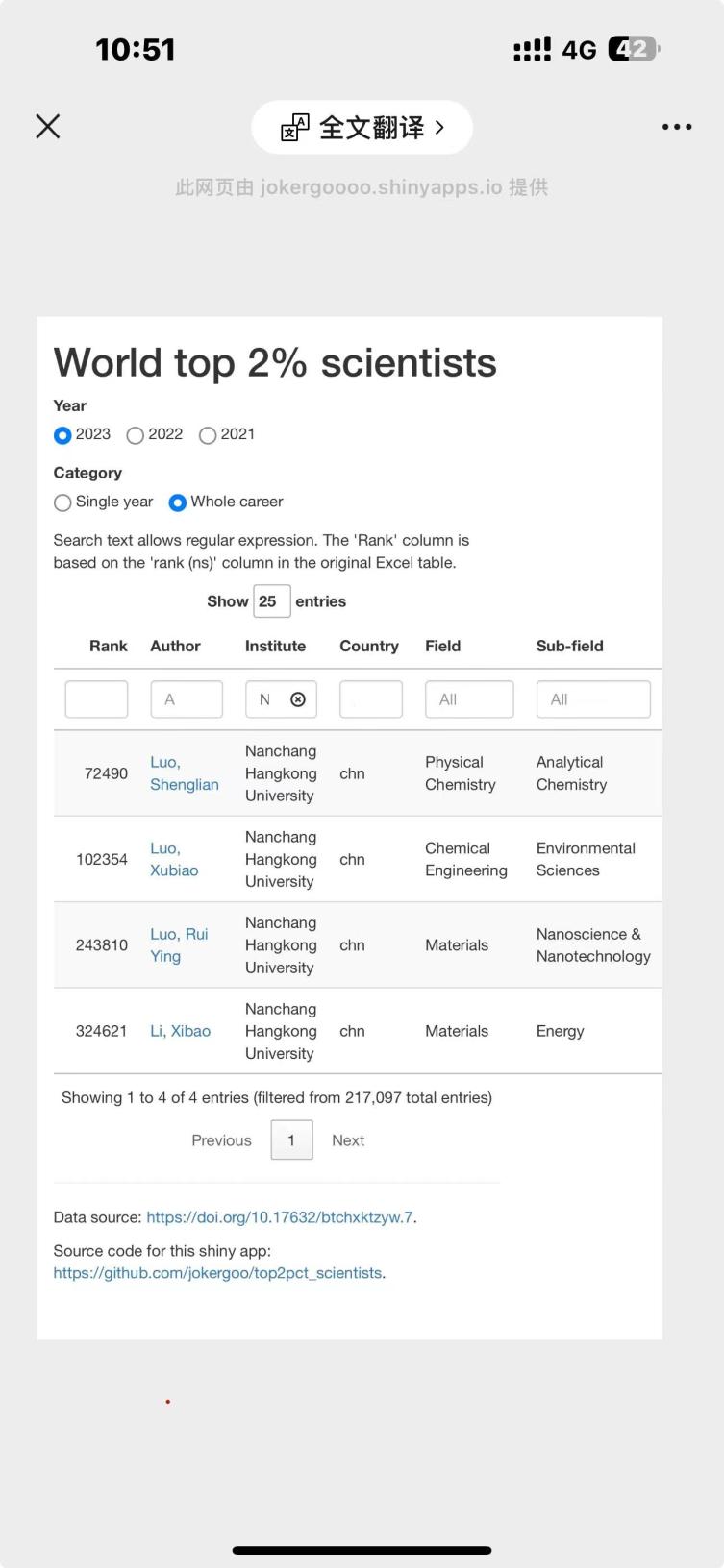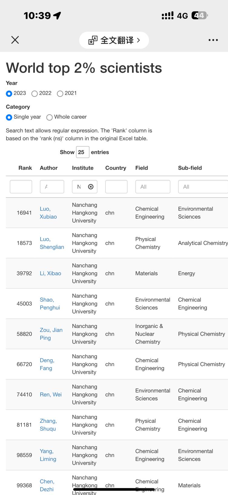 2024年9月,美國斯坦福大學(xué)和愛思唯爾數(shù)據(jù)庫(Elsevier Data Repository)發(fā)布《全球前2%頂尖科學(xué)家榜單》(World Top 2% Scientists List)。本次發(fā)布的榜單統(tǒng)計數(shù)據(jù)時間節(jié)點為1960-2023年,共分為22個科學(xué)領(lǐng)域和176個子方向。每位科學(xué)家被劃分到一個領(lǐng)域和2個子方向中。該數(shù)據(jù)庫以全球最大的文摘和引文數(shù)據(jù)庫—Scopus數(shù)據(jù)庫為依據(jù),基于引用次數(shù)(Citations)、H指數(shù)(H-index)、同行合作調(diào)整后的HM指數(shù)(Co-authorship adjusted HM-index)、不同作者單位論文的引用量(Citations to papers in different authorship positions)和一個綜合指標(biāo)(Composite indicator)等多達(dá)40多項指標(biāo)的綜合分析,為全球排名前10萬的科學(xué)家進(jìn)行大數(shù)據(jù)排名。該數(shù)據(jù)評分側(cè)重于影響力(引文)而不是生產(chǎn)力(出版物數(shù)量)。