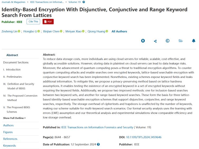 論文信息:Zesheng Lin, Hongbo Li, Xinjian Chen, Meiyan Xiao, Qiong Huang*. Identity-Based Encryption with Disjunctive, Conjunctive and Range Keyword Search from Lattices. IEEE Transactions on Information and Forensics Security, 19: 8644-8657. Sept. 2024, IEEE. DOI: 10.1109/TIFS.2024.3459646。