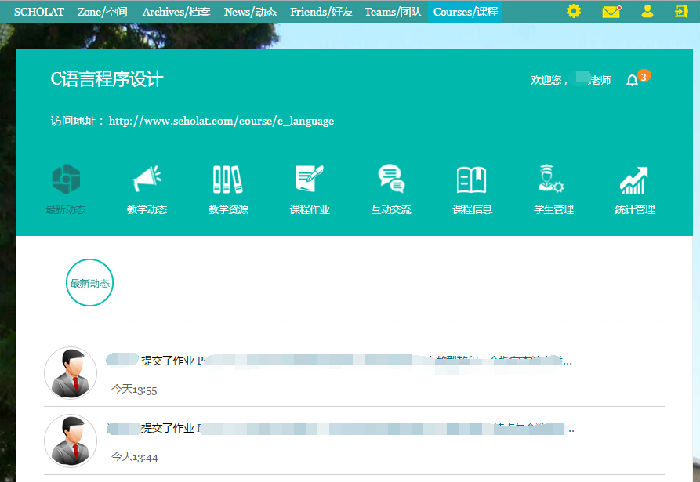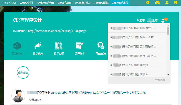 5.新增課程消息提醒。使師生不錯過任何一條提問、作業(yè)、公告消息。