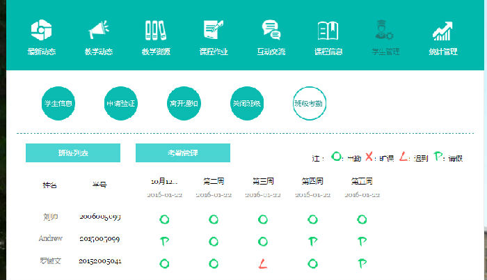 2.學生管理條目下新增考勤功能,滿足多數(shù)老師對在線考勤的需求。