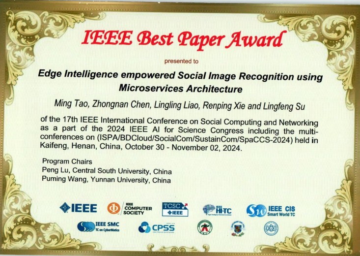 2. 2024年,實驗室論文“Edge Intelligence empowered Social Image Recognition using Microservices Architecture”在社會計算領(lǐng)域旗艦會議The 17th lEEE International Conference on Social Computing and Networking (lEEE SocialCom 2024)上被評為最佳論文。